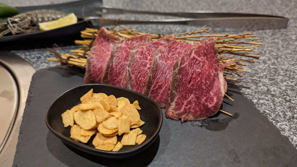 アツアツの状態でお肉を一口とべると肉のうまみがあふれ出します。良質なお肉にわさびやニンニクチップスを添え、途中で味を変えられるのも嬉しいところです。
