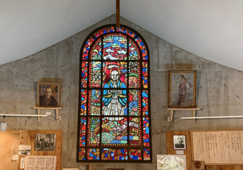 石井十次はキリスト教を厚く信仰したと言われており、資料館の奥には、石井十次を描いたステンドグラスが施されています。
